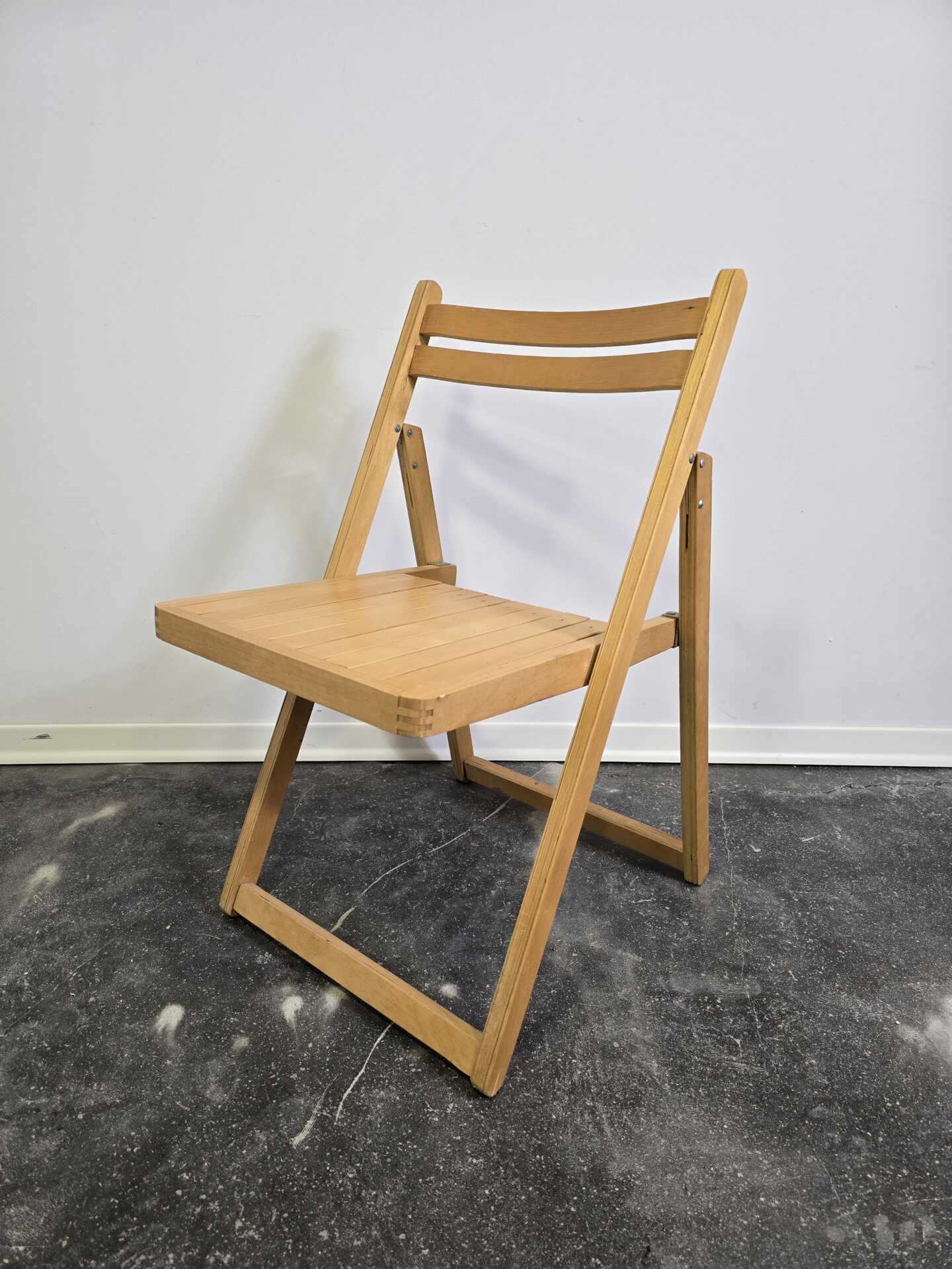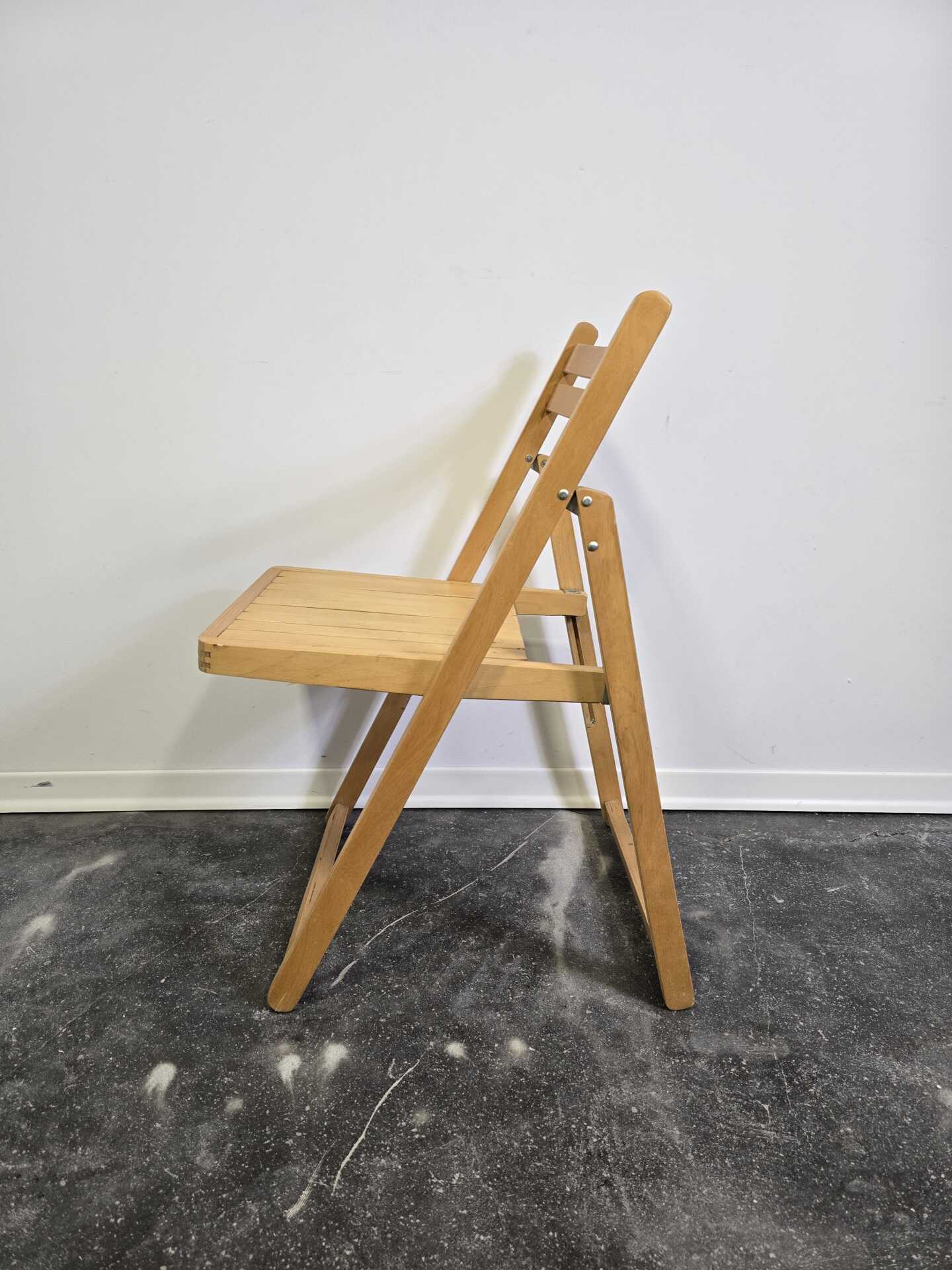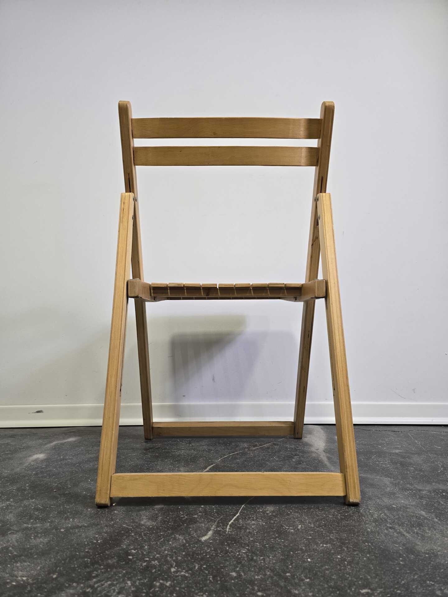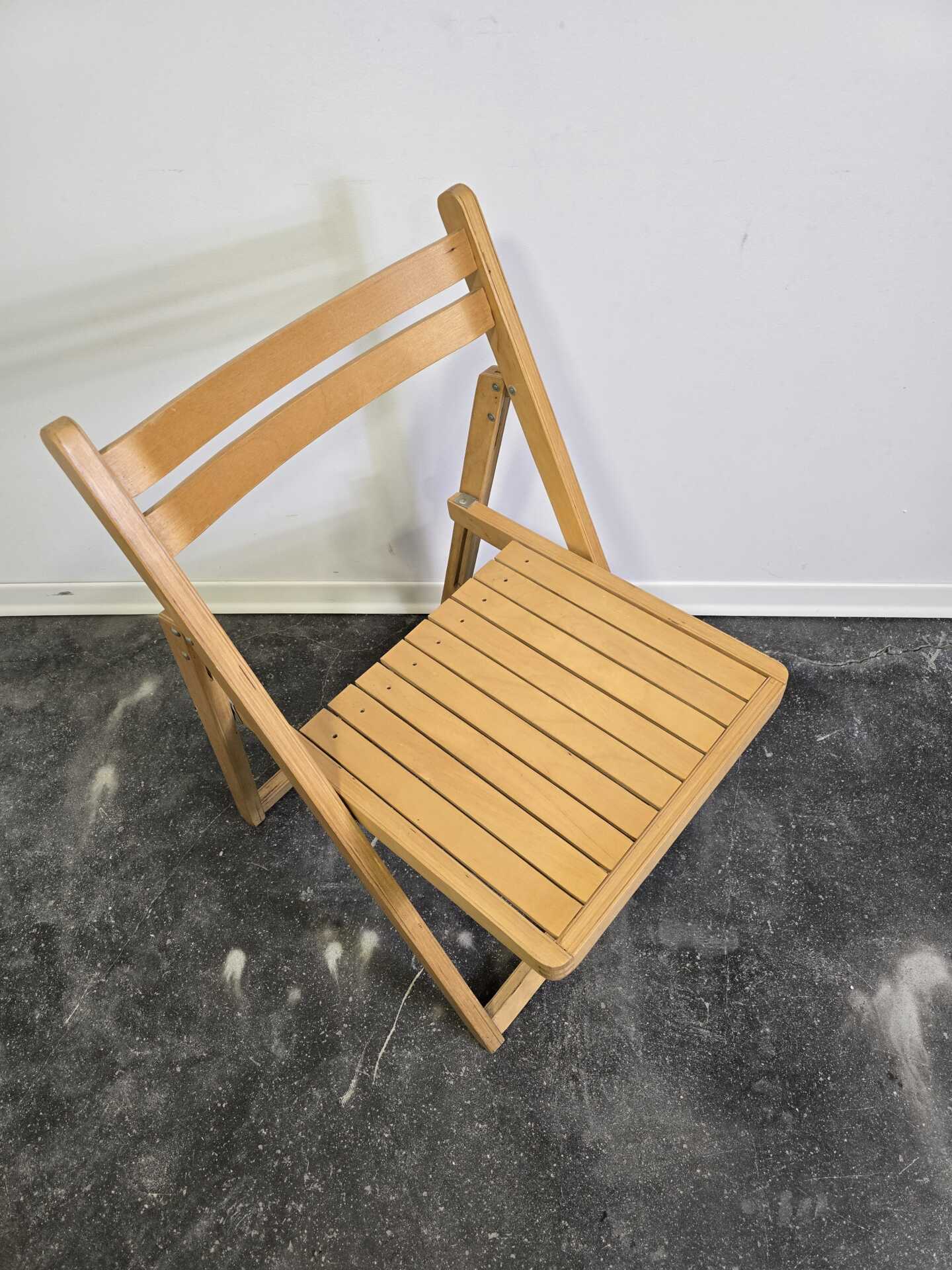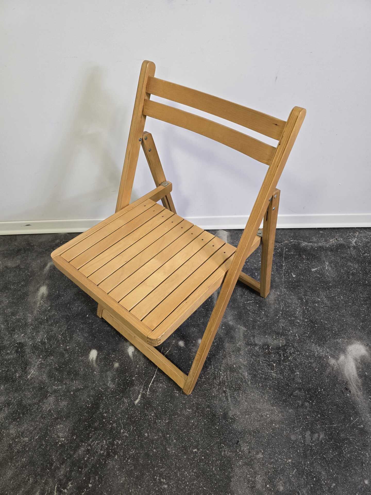 The gently angled backrest and slatted seat offer comfortable everyday seating, while the folding frame makes it easy to store—perfect for flexible living spaces, studios, or as occasional seating. Built to last, this chair has the solid feel and craftsmanship typical of furniture made before mass-production shortcuts became the norm.