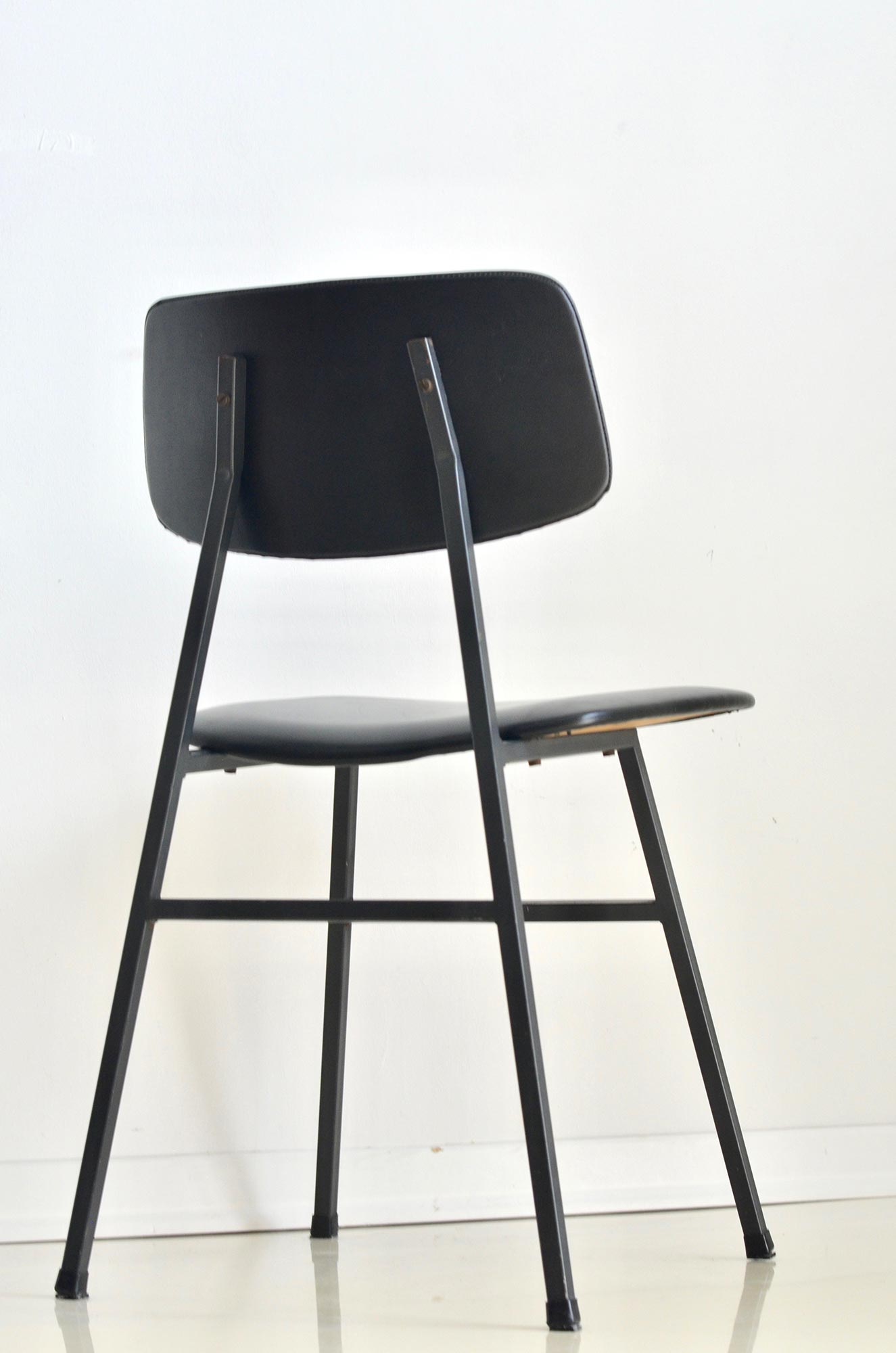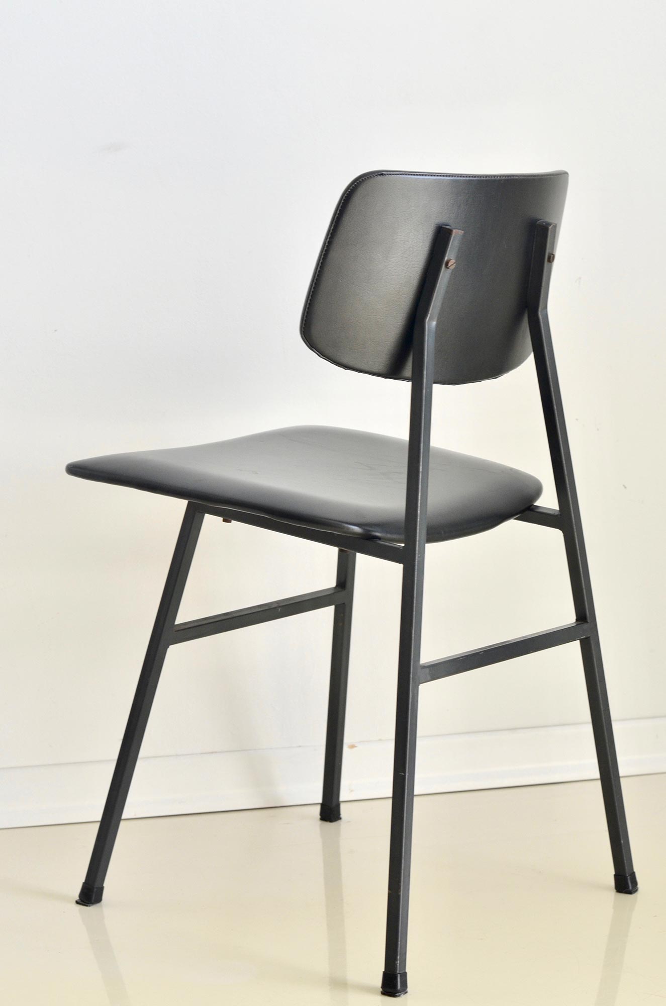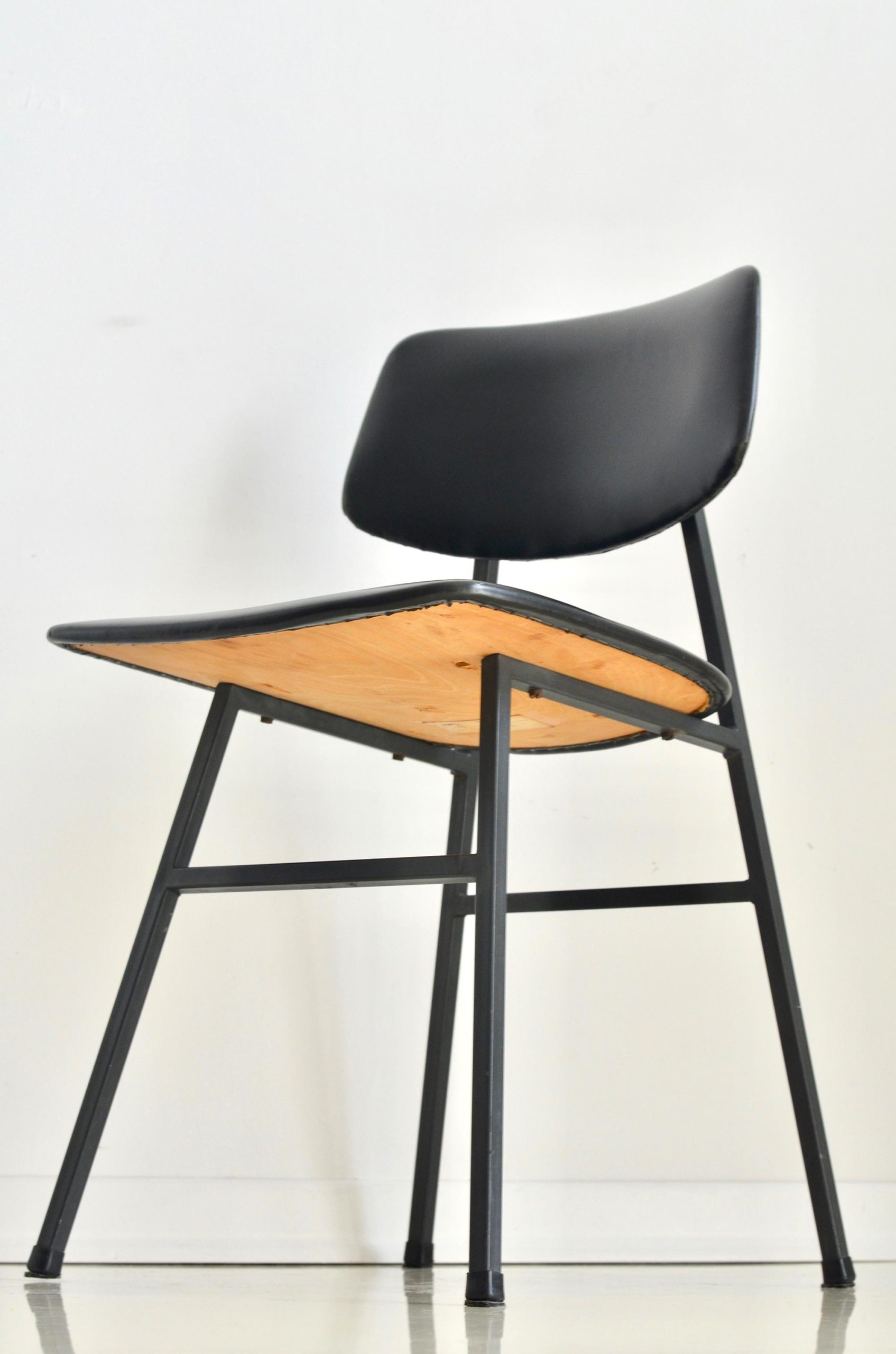 This small yet beautiful chair is perfect example of minimalistic mid century design. Solid metal frame and plywood covered win black faux leather bring elegant esthetics to your home or office.