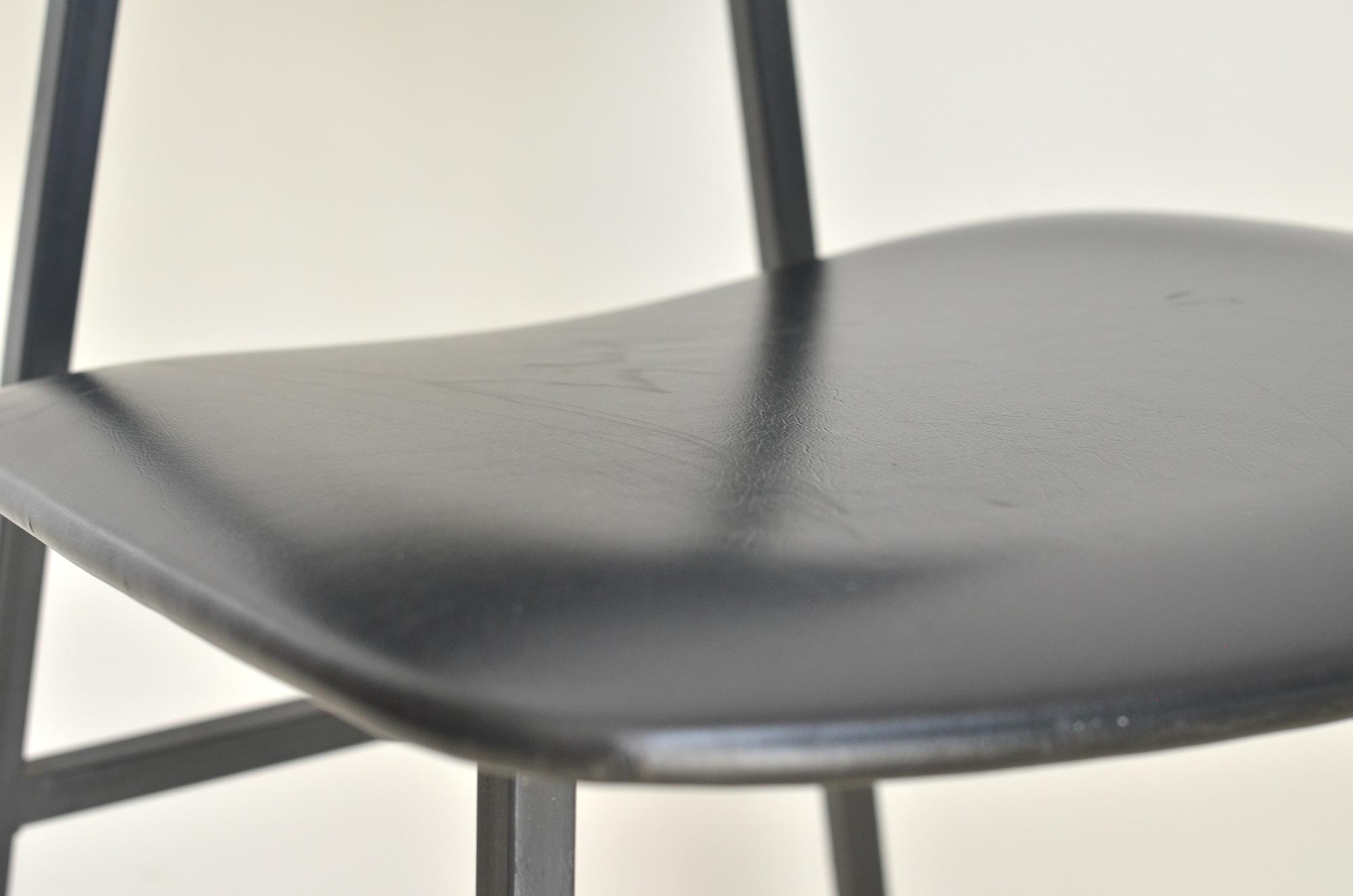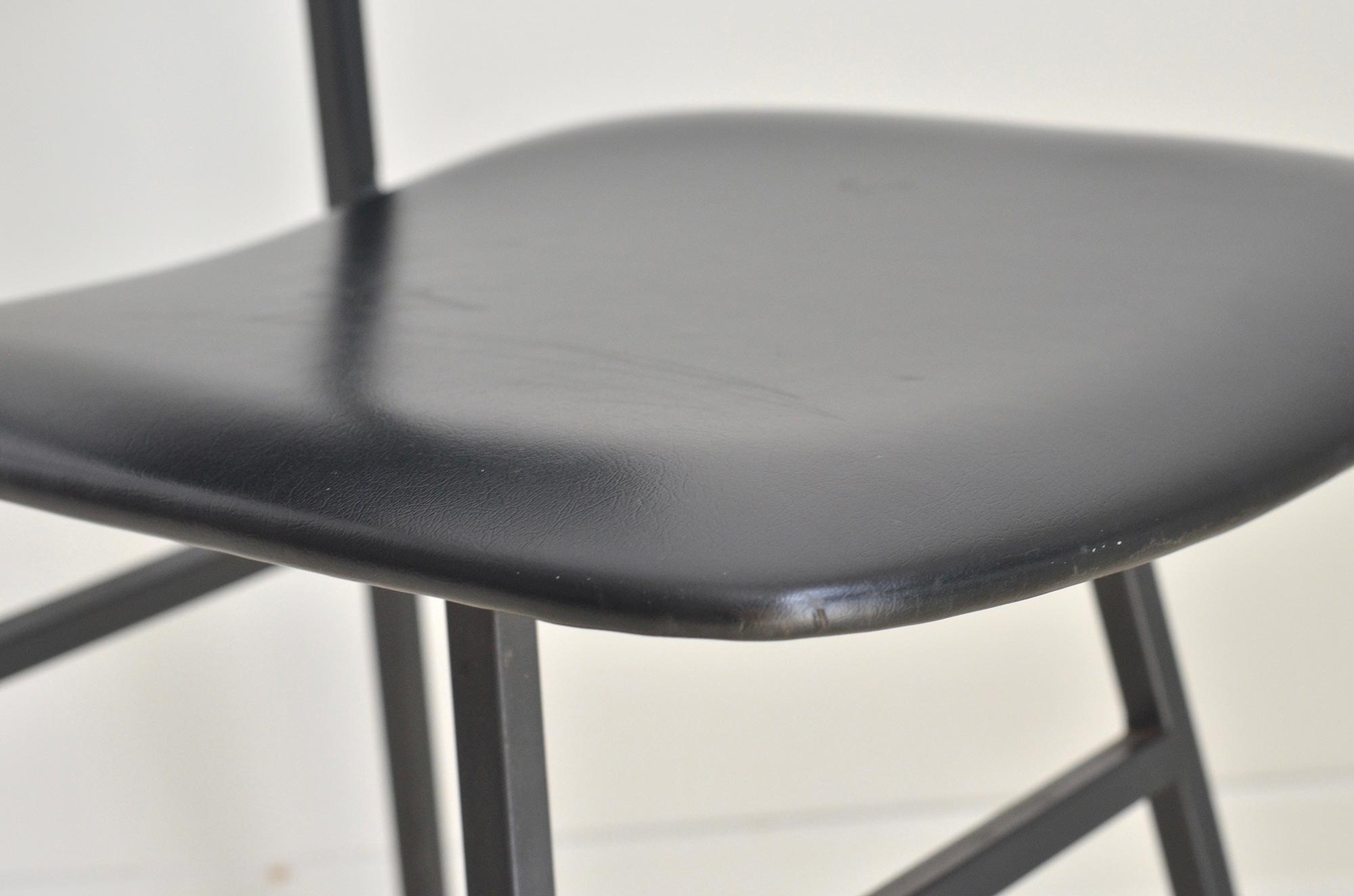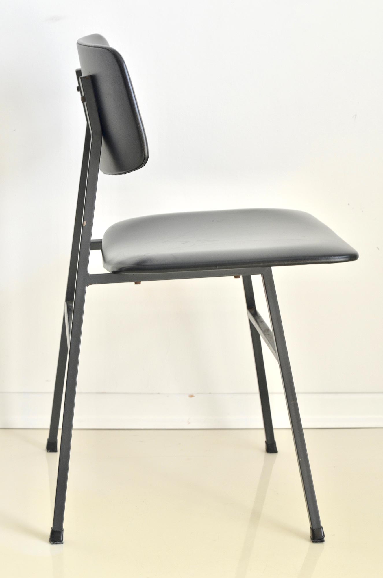 This small yet beautiful chair is perfect example of minimalistic mid century design. Solid metal frame and plywood covered win black faux leather bring elegant esthetics to your home or office.